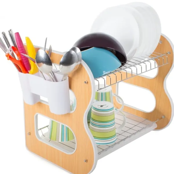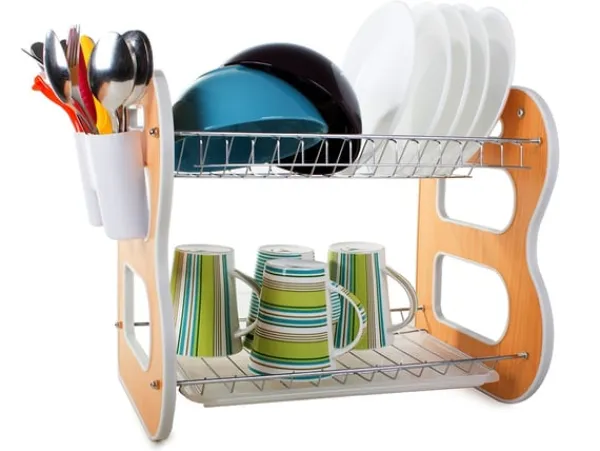 Torkstället är mycket rymligt och har plats för14 tallrikar, insatta i vertikala fack, den nedre nivån kommer ocksåhållaskålar, koppar, muggar och andra köksredskap.