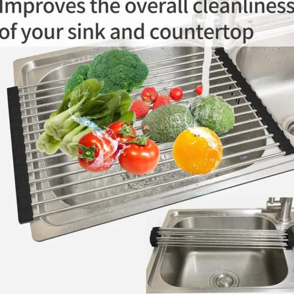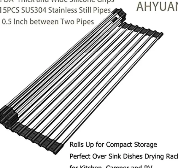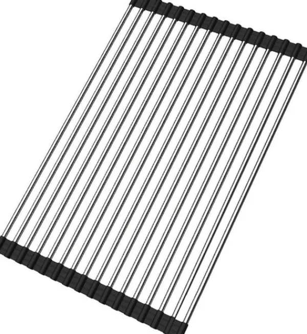 Detta flexibla och hållbara diskställ i rostfritt stål rullas ihop för enkel förvaring och tål höga temperaturer, vilket håller din diskbänk organiserad!