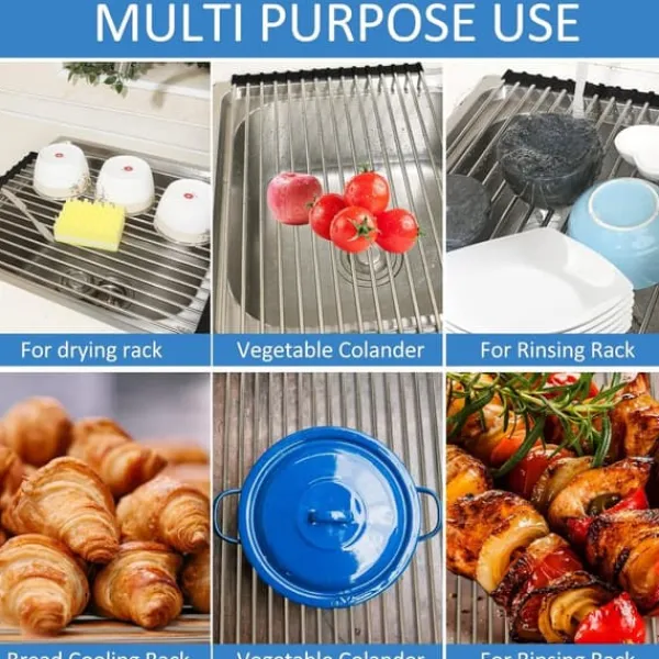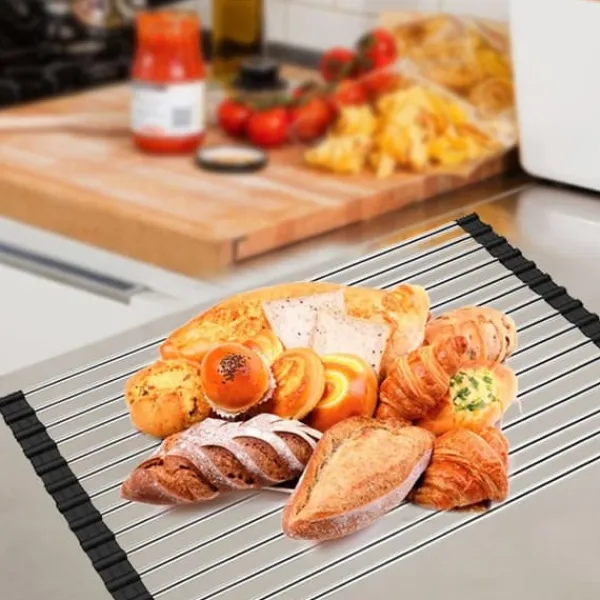 Detta rullbara diskställ kan placeras på en öppen diskbänk för att torka disk, eller användas som en extra bänkskiva eller värmeisolerande matta. Den är också perfekt för att hälla av grönsaker och frukt – en idealisk och mångsidig kökshjälp.