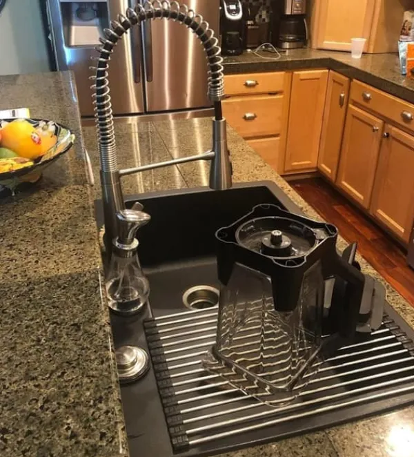 Detta diskställ är värmebeständigt upp till 232 °C (450 °F) och BPA-fritt.Du kan skölja det direkt med varmt vatten och till och med placera varma kastruller på det utan att oroa dig för skador – det är en säker och pålitlig köksapparat.