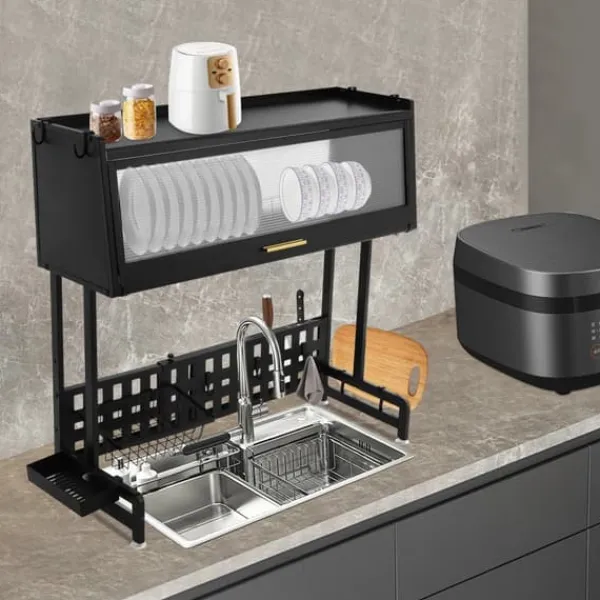 Diskställ med överskåp över diskbänken – svartModern tork- och förvaringslösning i kolstål med stängd dörr som skyddar mot damm. Smart ventilation och hög kapacitet ger snabb avrinning och ordning på liten yta – perfekt för en prydlig, effektiv kökshörna.