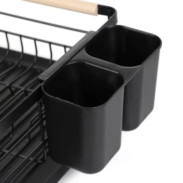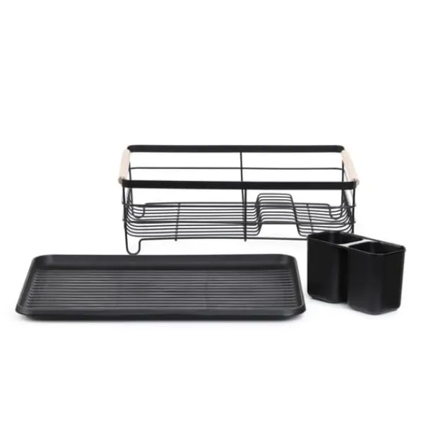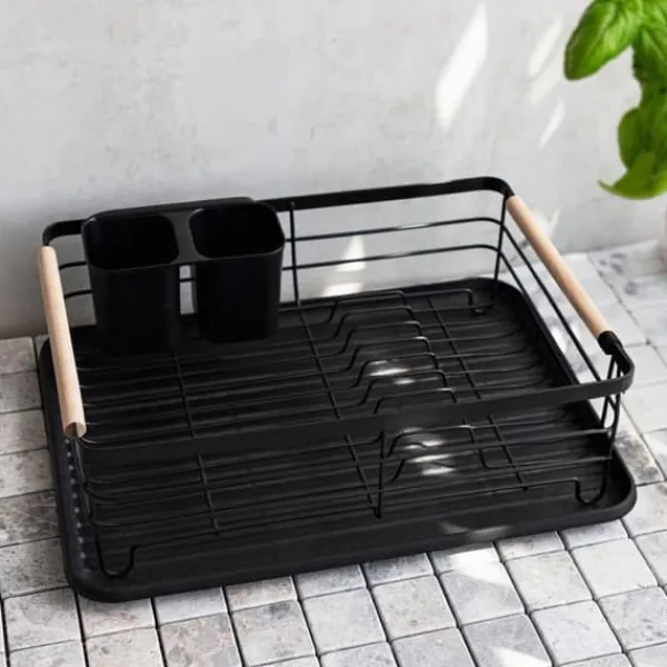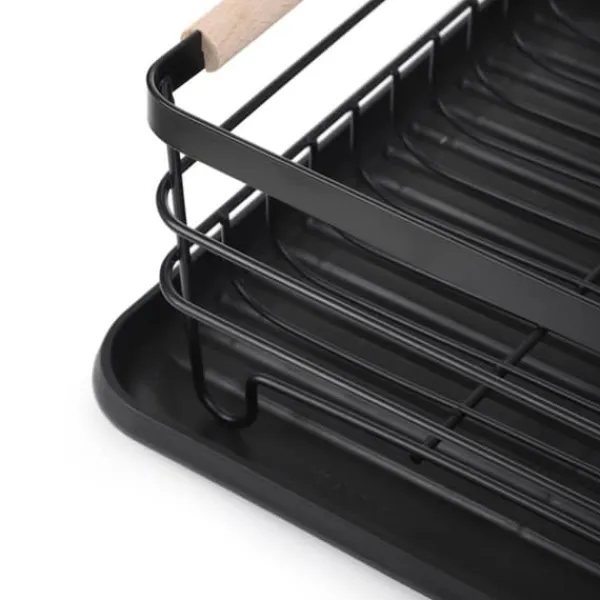 PLYSTRE-avrinningslådan har utformats med bekvämlighet och estetik i åtanke. Dess rymliga design möjliggör torkning av en mängd olika diskrätter – från tallrikar till koppar och kastruller. Två separata bestickfack underlättar snabb torkning, medan en robust plastbricka i botten samlar upp vatten och förhindrar att det spills på köksbänken.