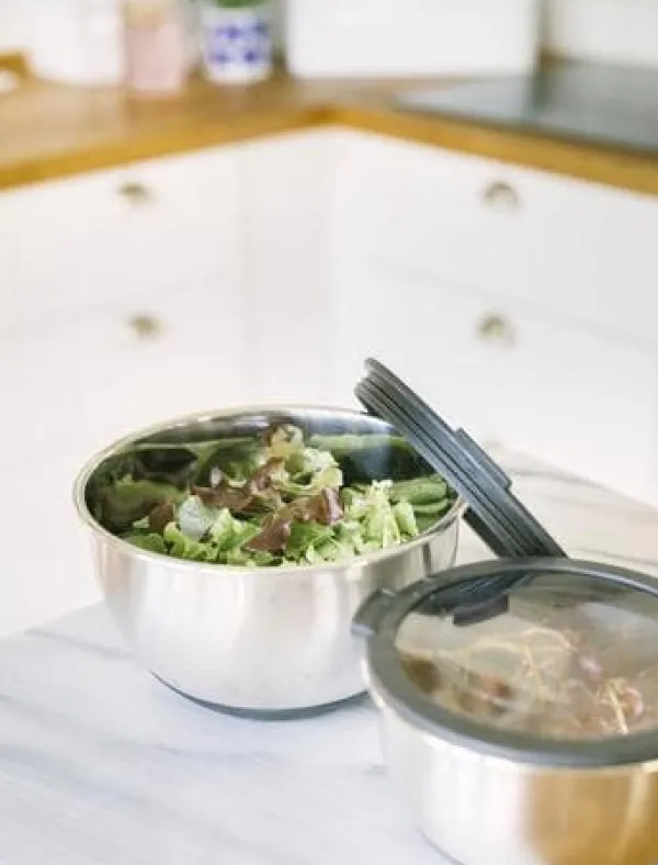I setet ingår 2 st bunkar 2,5 & 1 liter i rostfritt stål med var sitt plastlock med silikonkant