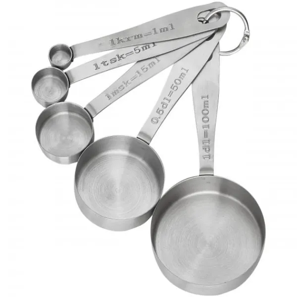Du får ett praktiskt och stilfullt måttsats i rostfritt stål, som har allt från kryddmått till decilitermått. Denna måttsats är ett slitstarkt verktyg som kommer håller livet ut och är en stark komponent till ditt köksarsenal.