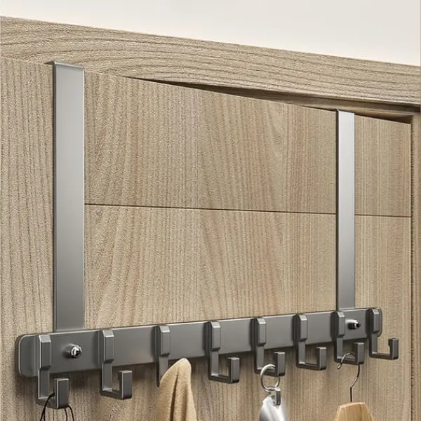 Denna dörrhängare är en smart lösning för att skapa extra förvaring i hemmet utan att ta upp golvyta. Med sina 5 krokar erbjuder den gott om plats för att hänga jackor, väskor, nycklar och andra föremål. Tillverkad av högkvalitativ aluminium är den både hållbar och elegant med en modern grå finish.