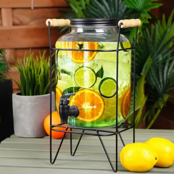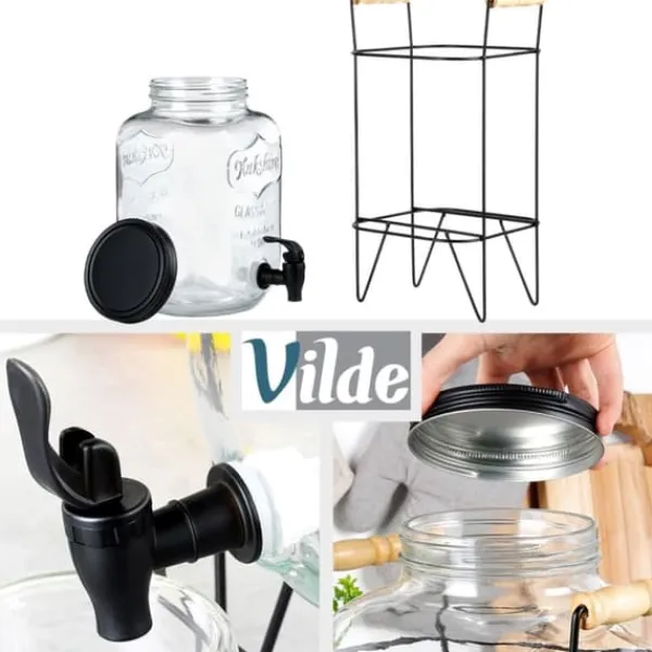 Detta set består av en burk med kran och stativ. Perfekt för att servera vatten, lemonad, juice, iste, smaksatt vatten och till och med punch. Kranen gör det enkelt att servera dina favoritdrycker på ett iögonfallande sätt. Burken med stativ kan användas både i trädgården och vid familjesammankomster. Det låsbara locket förhindrar att insekter kommer in i din dryck. Den är gjord av hälsosäkra och livsmedelsneutrala material. Ej lämplig för varma drycker. Observera! Förpackningen innehåller felaktig information om kapacitet; den faktiska kapaciteten är enligt beskrivningen ovan.Original Vilde produkt.Tillverkad i enlighet med europeiska standarder.