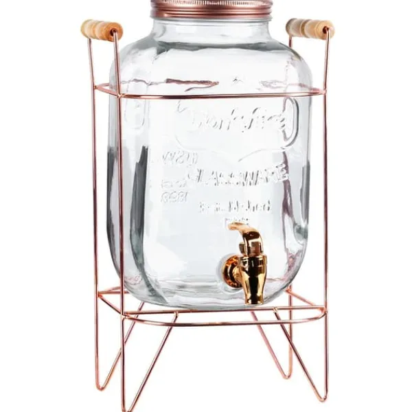 Detta set består av en burk med kran och ett burkställ. Perfekt för att servera vatten, lemonad, juice, iste, smaksatt vatten och till och med punch. Kranen gör det enkelt att servera dina favoritdrycker på ett imponerande sätt. Burken med stativ kan användas både i trädgården och vid familjesammankomster. Det låsbara locket förhindrar att insekter kommer in i din dryck. Den är gjord av hälsosäkra och livsmedelssäkra material. Ej lämplig för varma drycker. Notera! Förpackningen innehåller felaktig information om kapaciteten, den faktiska kapaciteten är enligt beskrivningen ovan.