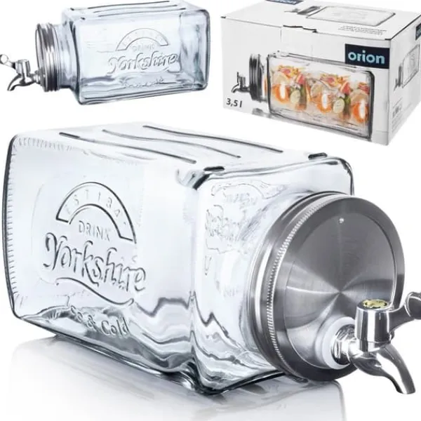 Glasdispenser med kran, perfekt för att servera vatten, lemonad, juice, iste, smaksatt vatten och punch. Lämplig för förvaring i kylen. Kranen gör det enkelt att servera dina favoritdrycker på ett imponerande sätt. Burken kan användas både i trädgården och vid familjesammankomster. Det låsbara locket förhindrar att insekter kommer in i din dryck.En originalprodukt från det tjeckiska märket Orion.Tillverkad i enlighet med europeiska standarder.