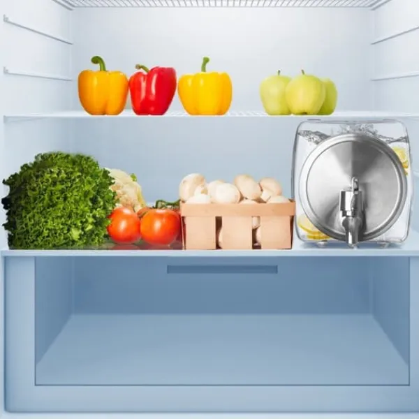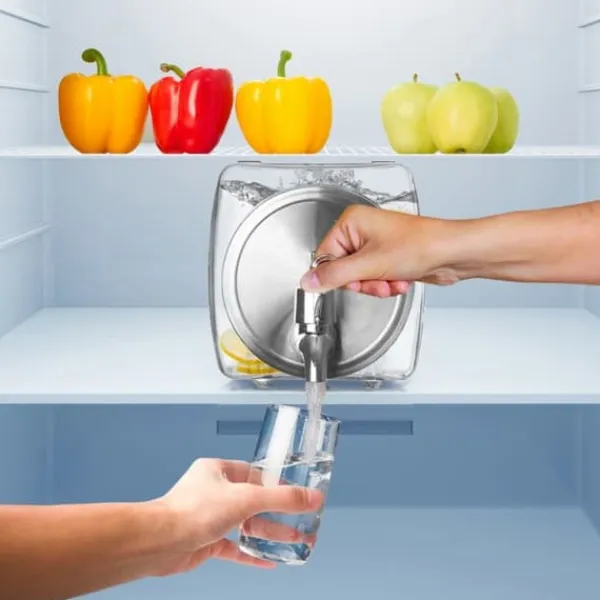 En dricksburk med kran, perfekt för att servera drinkar med fruktbitar eller is. Lämplig att ställa på en kylhylla.