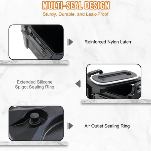 Icke-elektrisk isolering: Vår varm- och kalldryckesautomat består av en LDPE-yta och ett 23 mm tjockt PU-skumlager, vilket gör den till ditt första val för utmärkt isolering. Den håller dina drycker i mer än 10 timmar på den ideala temperaturen utan att behöva elektricitet eller en extern energikälla. De två integrerade nylonlåsen stänger locket säkert och säkerställer den önskade innetemperaturen.