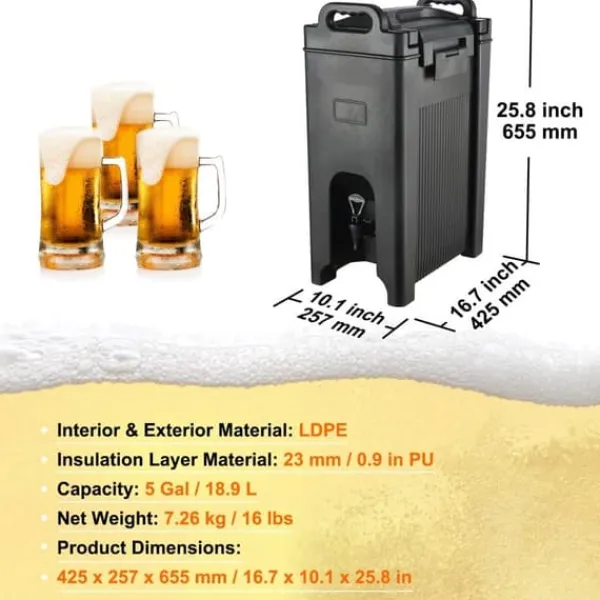 Stort 18,9 L kapacitet: Vi presenterar vår isolerade dryckesdispenser med en kapacitet på 5 gallon (18,9 L) som håller dina varma eller kalla drycker som juice, kaffe, mjölk och te vid den perfekta temperaturen. Vi är stolta över att använda livsmedelsklassade material för alla komponenter som kommer i kontakt med dina drycker. Upplev högsta kvalitet i dryckesservicen!