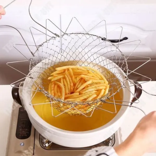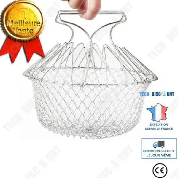 Den här vikbara avloppskorgen i rostfritt stål som mäter 23 cm x 12 cm x 16 cm är idealisk för att tvätta grönsaker och filtrera vatten. Det förlängda handtaget möjliggör enkel borttagning och tål värme, perfekt för allmänt köksanvändning.