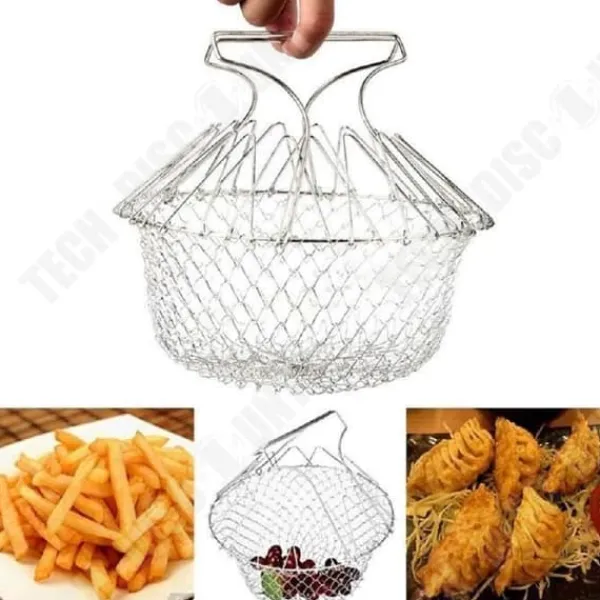 Upptäck den hopfällbara salladskorgen TD®, i silverfärgad rostfritt stål. Praktisk och lätt (130g), den mäter 23.5cm i diameter och 9.5cm i höjd. Idealisk för att optimera ditt förvaringsutrymme i köket.