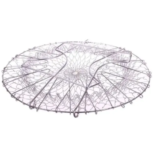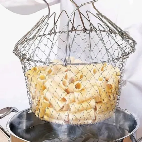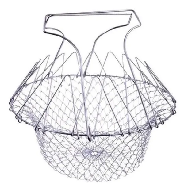 Denna hopfällbara salladskorg i rostfritt stål är hållbar och rostbeständig. Idealisk för att skölja, rinna av eller ångkoka dina grönsaker och pommes frites. Praktisk och lätt att förvara, den är perfekt för förvaring av frukt och snacks. Säljs i set om 2, den kombinerar funktionalitet och kvalitet.
