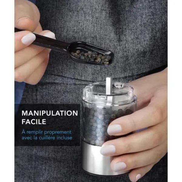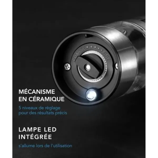Set av elektriska salt- och pepparkvarnar i rostfritt stål med litiumjonbatteri. Precist keramiskt krossmekanism, LED-lampa och basstation. Lätt att använda och rengöra, inkluderar en USB-C-kabel, en borste och en sked. Perfekt som present till matälskare.