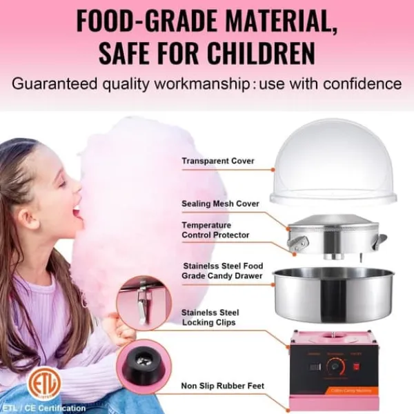Denna bomullsmaskin låter dig använda traditionellt tandtrådssocker, mjölksocker, frukttärningar eller något av dina hårda favoritgodisar för att göra läckra sockervadd. Med en kompakt storlek är den lämplig för bänkskiva och den är perfekt för karnevaler, festivaler, födelsedagsfester och sportevenemang.