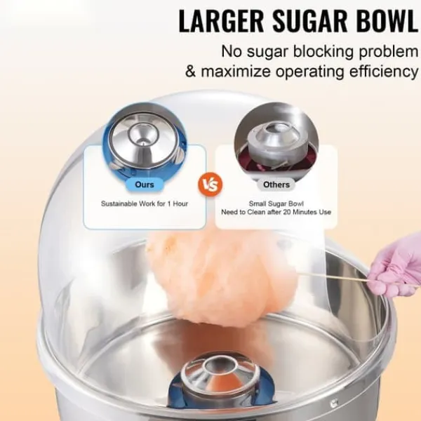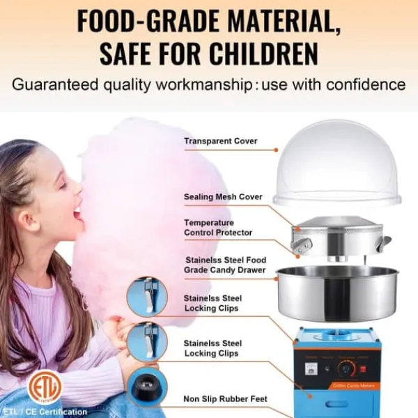 Denna sockervadsmaskin har en godislåda för extra lagringsutrymme, sockersked för enklare hantering av socker, och tätning för att förhindra att socker faller in i maskinen. ETL/CE-certifiering ger extra säkerhet, och det transparenta locket förhindrar att främmande föremål kommer in i maskinen.