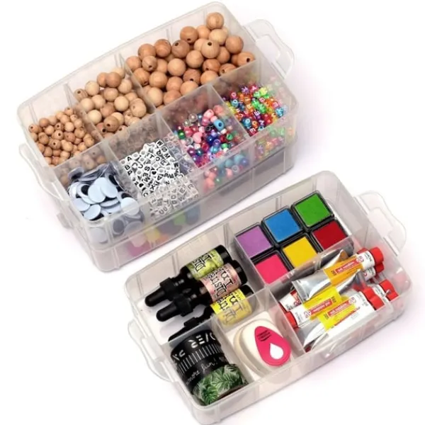 Förvaringslådan består av 3 lager som du enkelt klickar ihop. Förutom hobbytillbehör som smyckestillverkning, diamantmålning, mosaik, korttillverkning och scrapbooking, är sorteringssystemet också idealiskt för att förvara smink, skruvar och mindre byggklossar.