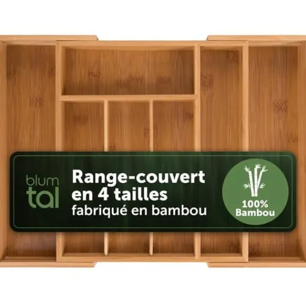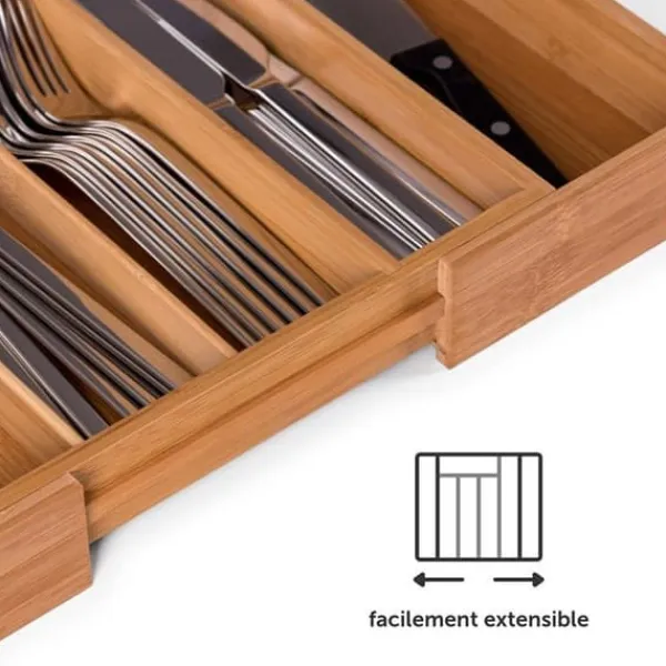 Organisatör för justerbar låda i högkvalitativ bambu, anpassar sig från 29 x 33 x 5 cm till 45,5 x 33 x 5 cm. Med 5 fack i normal konfiguration och 7 i utvidgad konfiguration, möjliggör den enkel förvaring av dina bestick och tillbehör. Perfekt för köket, kontoret eller badrummet.
