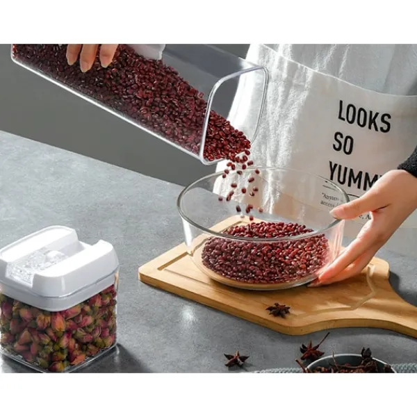 Varje burk har ett lock med en vakuumknappmekanism. När den trycks in avlägsnas luften från insidan, vilket säkerställer ett tätt och säkert förslutning. För att öppna burken, lyft bara på spännet – det praktiska enhandssystemet gör burkarna snabba och lätta att använda.