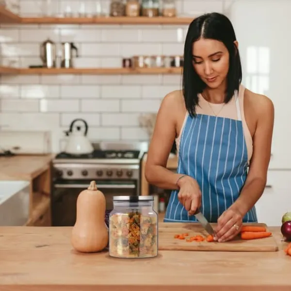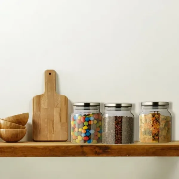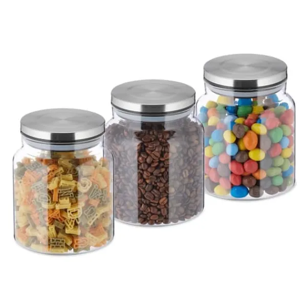 Detta praktiska set med tre glasförvaringsburkar är perfekt för att organisera och bevara olika torra livsmedel i ditt kök. De lufttäta locken i rostfritt stål med tätningsringar håller innehållet fräscht, medan den klara glasdesignen gör det enkelt att identifiera vad som finns i burkarna. Dessa burkar är lätta att rengöra och hjälper till att spara utrymme i ditt skafferi.