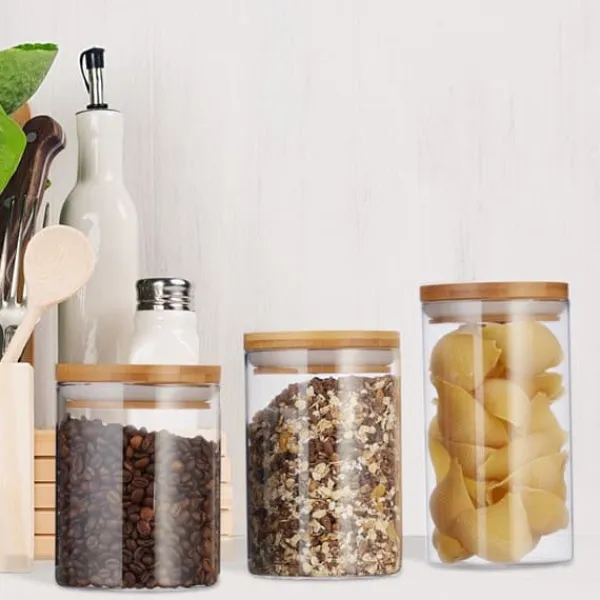 Praktiska glasbehållare för köket i olika storlekar. Håll ordning i dina kökslådor! Detta set med glasbehållare innehåller 3 behållare i olika storlekar. Använd dessa multifunktionella glas för flingor, nudlar, pasta, ris eller godis. Locket i bambu med gummiring stänger nerbehållaren för nudlar tätt. Det är fortfarande lätt att öppna. På grund av den enkla designen passar behållarna perfekt in i ett kök. Dessutom är dessa glas diskmaskinssäkra.