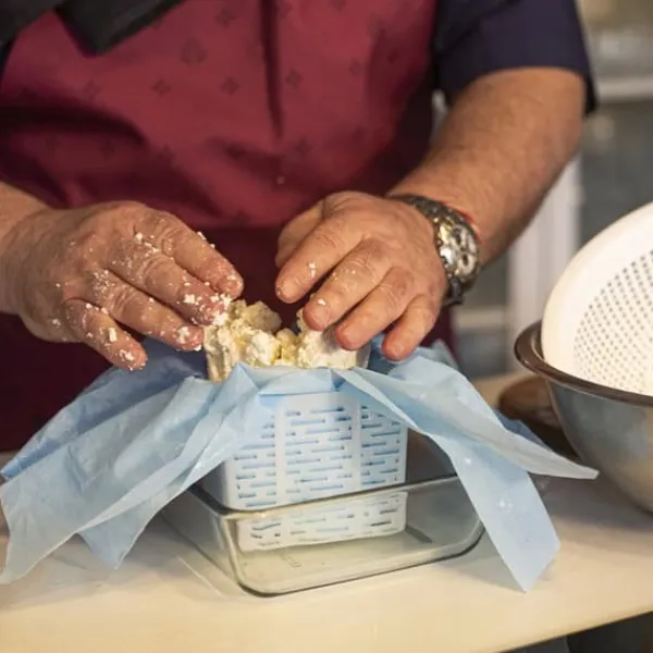 - För att uppnå bästa möjliga släta ostmassa på vasslesidan, lägg ostmassan på en jämnare yta och släta osten. av tyget.