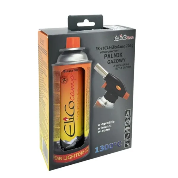 TEKNISKA DATA: Ventiltyp: klick, bajonettfattning Gastyp: butan Fungerar med ElicoCamp 220g patroner Piezoelektrisk tändning Flamlås för kontinuerlig drift Jämn effektreglering med ett vred Gasförbrukning: 80 g/h Energi: 1,12 KW Maximal temperatur: 1300°C Flamlängd: upp till 7 cm