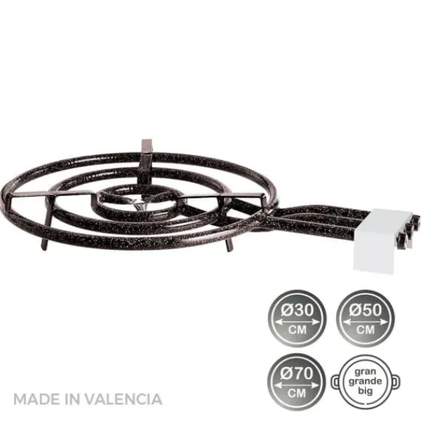 Butan/Propan Gasbrännare Ø70cm 3 Brännare (För Paella). Tillverkad av emaljbelagt laminerat stål.Specifikationer:- Vikt: 6 kg- Typ: Brännare- Omfattning: Ø70cm- Material: Emaljbelagt valsat stål- Kompatibilitet: Butan/propangas- Modell: 3 eldar
