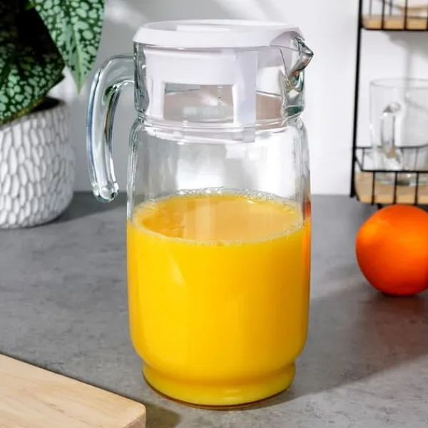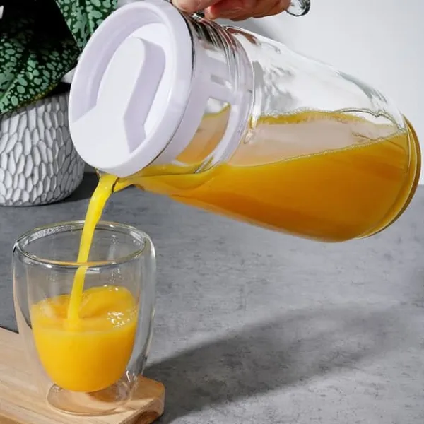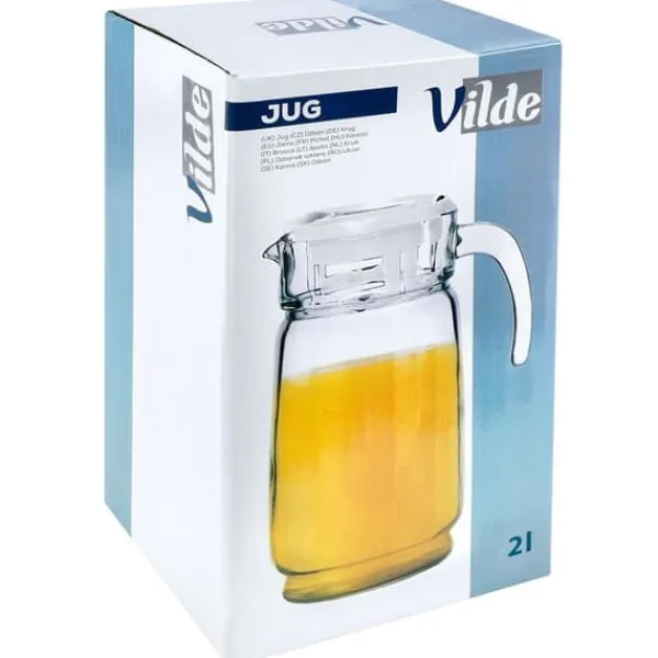 Glaskanna för drycker. Bekväm att använda. Den konturerade pipen gör det exceptionellt enkelt att hälla. Kannan är perfekt för att servera en mängd olika drycker. Den tål diskmaskin utan lock. Du kan förvara drycker i den i kylskåpet. Den har en klassisk form, vilket gör att den passar perfekt till alla typer av porslin. Original Vilde-produkt. Tillverkad i enlighet med europeiska standarder.