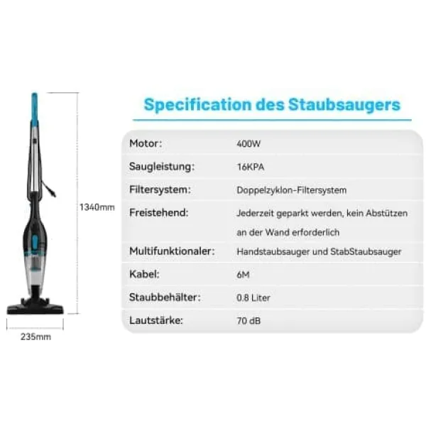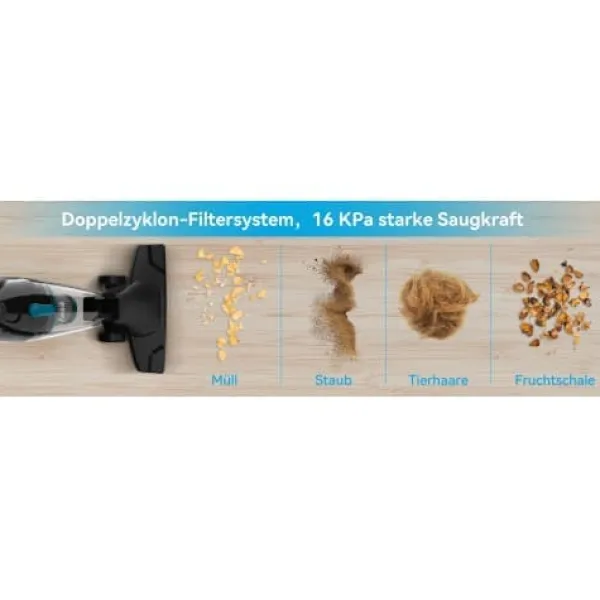 R3S Blue sladdade stavdammsugare erbjuder 16 kPa sugkraft som effektivt suger upp damm, hår och smulor. Perfekt för marmorgolv, kakel, trägolv och låghåriga mattor. Den är idealisk för ett rent och prydligt hem.