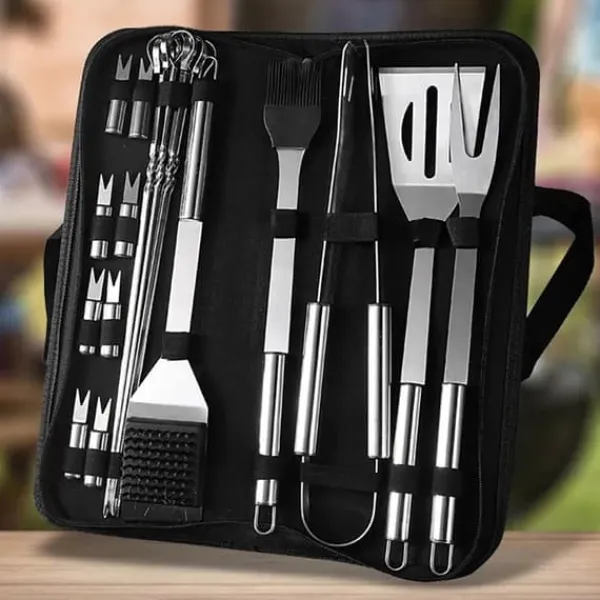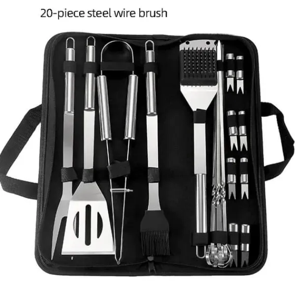 Tillverkat av rostfritt stål som tål hög värme och motstår korrosion. Setet innehåller 20 väsentliga verktyg: grillspade, grillgaffel, grillklämma, oljeborste, 7 grillspett, rengöringsborste och 8 majsgafflar – allt för att hantera alla grillbehov från hamburgare till stek.