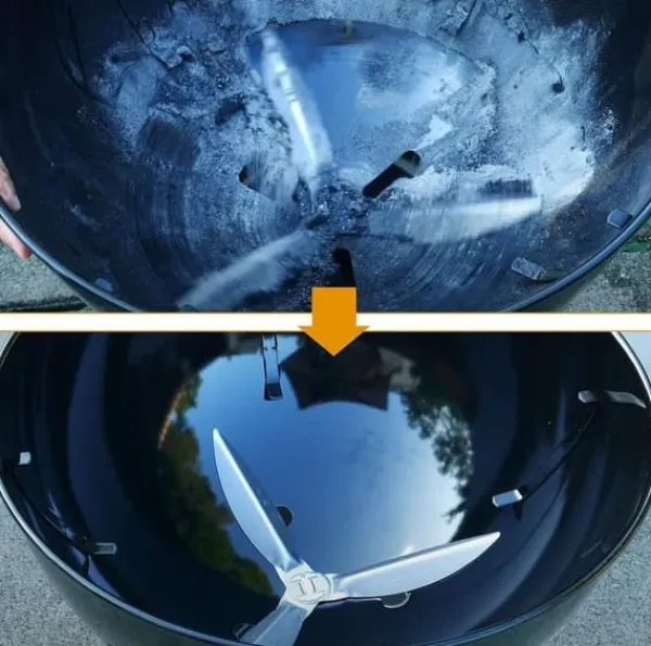 Genom att dra i spaken roterar bladen inuti grillen och skrapar enkelt bort smuts, kolrester och aska, som snabbt samlas i askbehållaren utan behov av manuell rengöring.