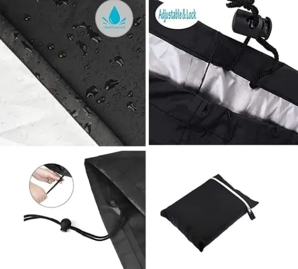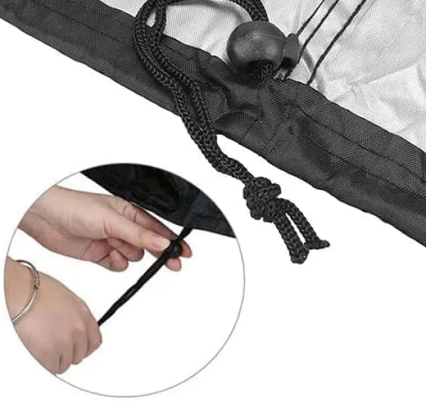 Grillskyddet har justerbara kardborreband på båda sidor för en tät passform, även under extrema väderförhållanden. Ett snöre i botten förhindrar att skyddet blåser bort, vilket ger pålitligt skydd i alla väder.