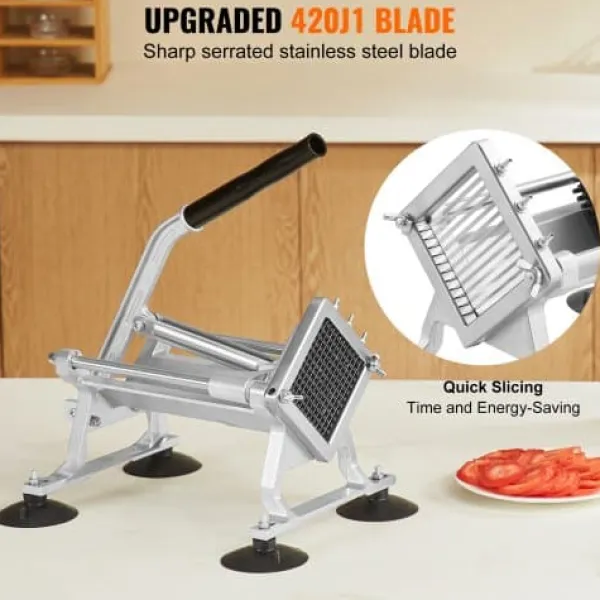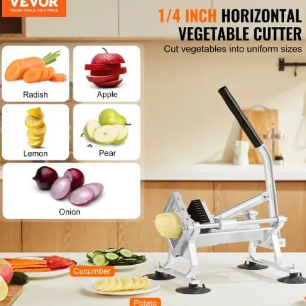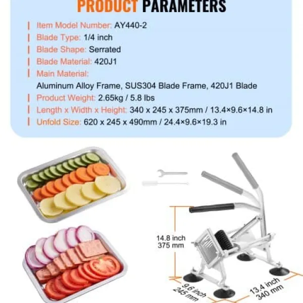 Denna kommersiella grönsaksskärare är utformad för effektiv och jämn skivning av olika frukter och grönsaker, vilket gör matförberedelser snabbare och enklare. Dess robusta konstruktion och halkfria fötter säkerställer stabilitet under användning, medan de löstagbara delarna möjliggör snabb och grundlig rengöring. Perfekt för både professionella kök och hemmakockar, hanterar denna manuella skärare ingredienser med varierande texturer med lätthet.