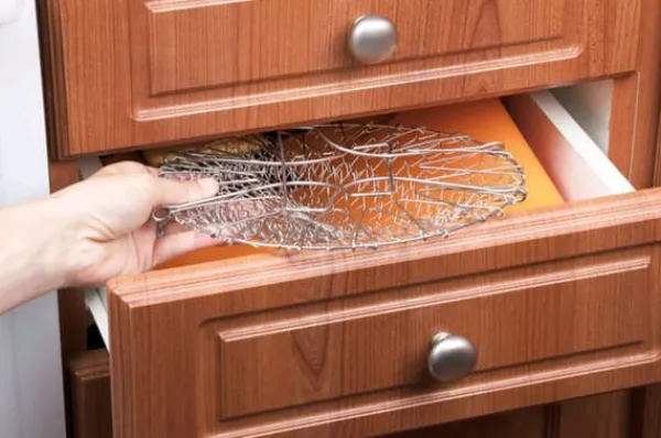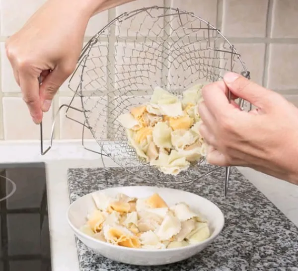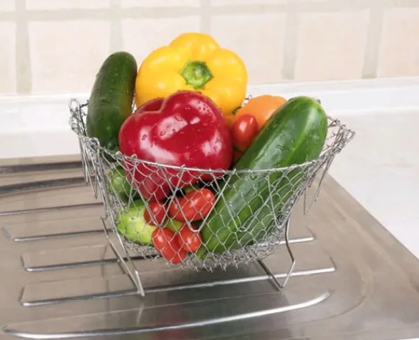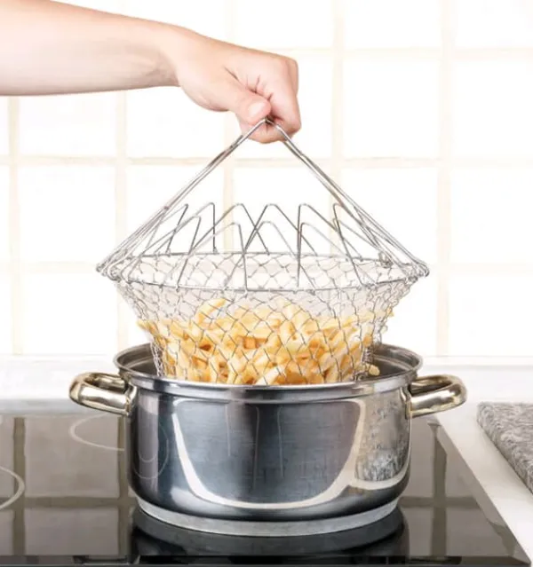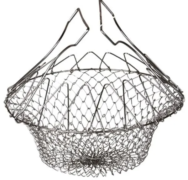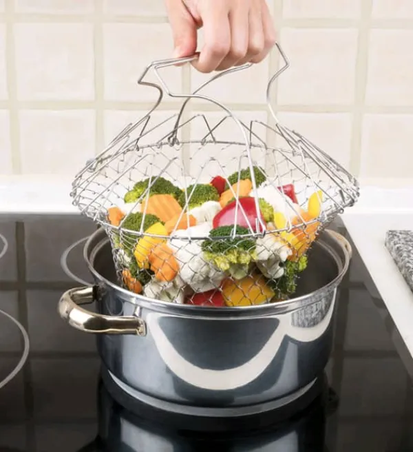 . Dess mått gör att den lätt passar i de flesta krukor. När du är klar med matlagningen kan korgen enkelt vikas ihop och förvaras i en låda, vilket sparar plats i köket. Dessutom kan den säkert