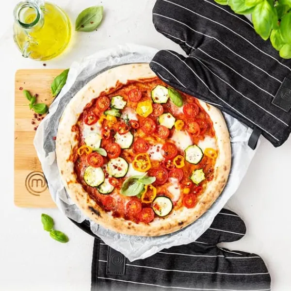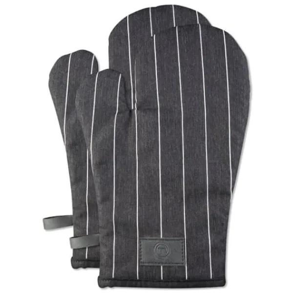 Säkerställ din säkerhet i köket med ugnshandskar från den populära tv-serien Mästerkocken. Dessa officiella Mästerkocken ugnhandskar har hög värmebeständighet och är ett perfekt skydd när du tar ut varma plåtar och kastruller ur ugnen eller lyfter heta grytor från spisen. Handskarna är tillverkade av 100% bomull och dekorerade med detaljer i veganskt läder för en modern touch.