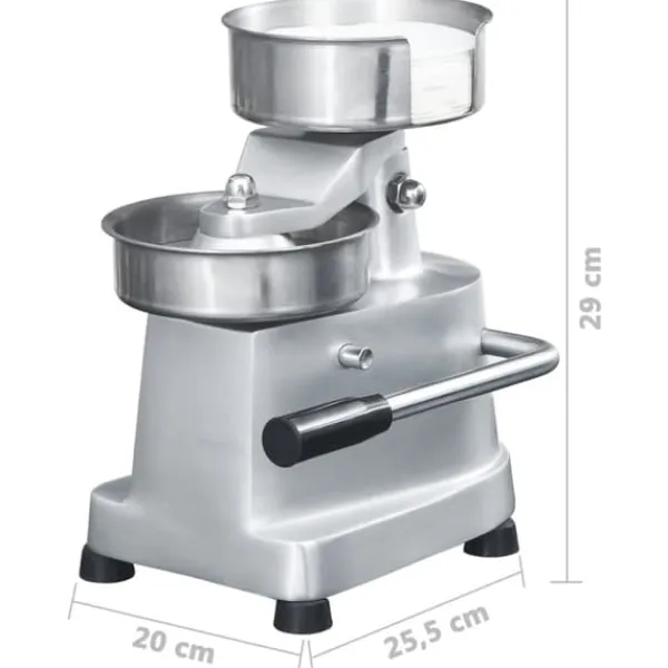 Hamburgerpressen används manuellt med en enkel spakmekanism. Med ett lyft på spaken kan du enkelt ta ut burgaren ur maskinen. Tack vare de medföljande pappersarken fastnar inte burgarna i varandra. Alla enskilda delar av hamburgerpressen kan rengöras utan problem. Tack vare dess lilla mått är hamburgerpressen mycket platsbesparande och kan användas på alla arbetsytor med dess halkfria gummifötter.