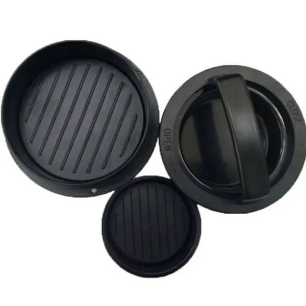 Hamburgerpress 3 i 1 KONVINIT i svart ABS-plast, mått 12,5 x 12,5 x 6 cm. Avtagbar och non-stick, den underlättar förberedelsen av hamburgare medan den sparar lagringsutrymme. Idealisk för grillfester och picknickar.
