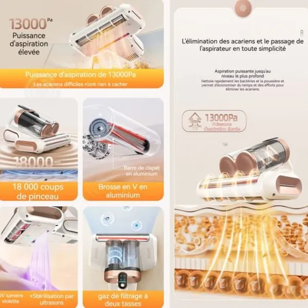 2. Effektiv rengöring: Kvalster-dammsugaren erbjuder en otrolig sugkraft på 13000 Pa och en hög takt på 8000 gånger/minut, vilket gör att den snabbt kan samla in fint damm djupt inbäddat i madrassen och eliminerar 99,99 % av allergenerna i din säng, madrass, kuddar, spjälsäng och matta.