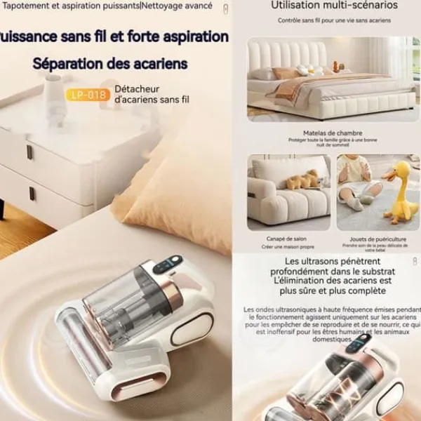 3. Djup rengöring genom ultraviolet: Vår innovativa dammsugare använder kraften av ultraljud för att förhindra damm och djurhår, vilket djupt eliminerar damm och kvalster och säkerställer en hälsosam sömnmiljö.