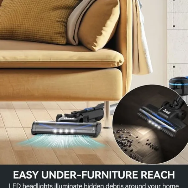 Belyst elektrisk golvborste Den elektriska golvborsten på denna handdammsugare är utrustad med 4 LED-lampor. Samtidigt kan denna handdammsugare även svänga flexibelt 90° framåt och bakåt och 150° åt vänster och höger, vilket gör att du kan lysa upp och rengöra osynliga hörn.