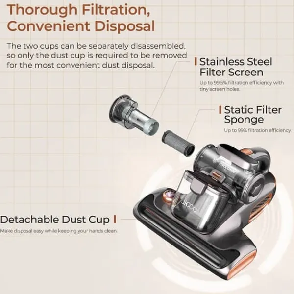 Kapaciteten för varje kopp har ökat avsevärt tack vare den separata dubbelkoppen. Filterkoppen kan filtrera bort även de minsta bakterierna, inte bara dammpartiklar, och den täpps inte till lätt som andra dammsugare med en kopp; Med en större volym på 0,5 liter – tre gånger så mycket som konkurrenterna – gör dammkoppen att du kan stöta bort dammkvalster på din säng, soffa och matta på en gång utan att behöva tömma dem upprepade gånger.