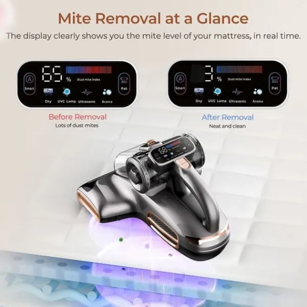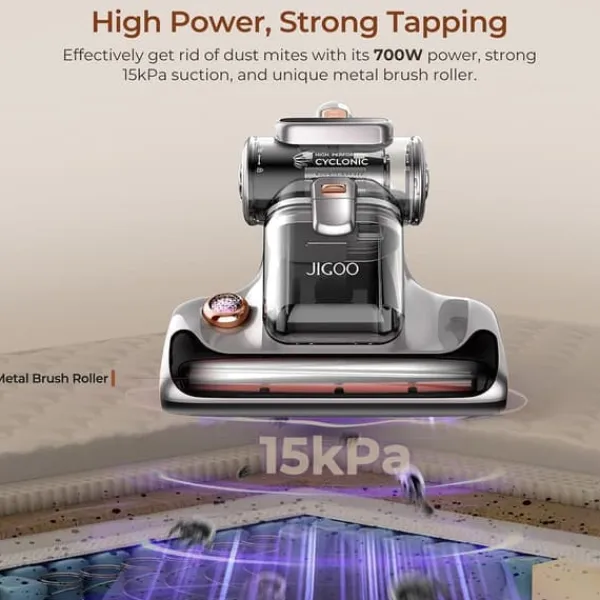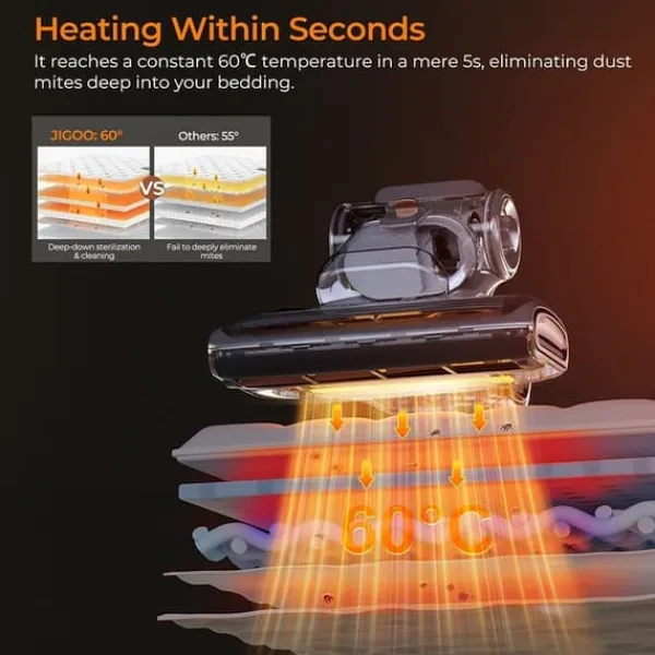 JIGOO madrassdammsugare kan ta bort 99,99 % av dammkvalster från dina sängkläder tack vare sin 700W höga effekt och 15 kPa vakuumsug, som fångar upp de flesta dammkvalster på ytan av dina sängkläder. Den har också en 800mW ultraviolett lampa och håller en konstant temperatur på 60°C för att tränga djupt in i tyget.
