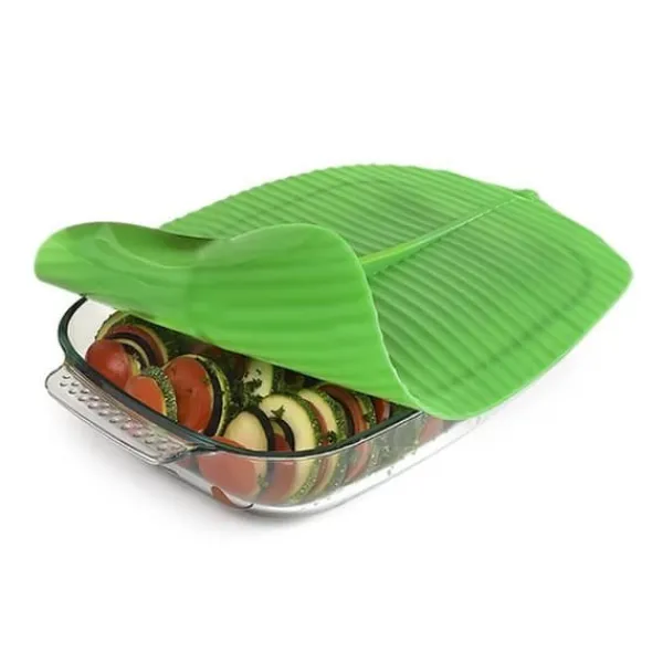 Tät förslutning i silikon i form av ett bananblad, perfekt för att bevara dina rätter. Multifunktionell, den tål temperaturer från -40°C till 230°C. Praktisk och estetisk, den ersätter plastfolie och är lätt att rengöra i diskmaskin. Ett oumbärligt tillbehör för en hälsosam och miljövänlig matlagning.