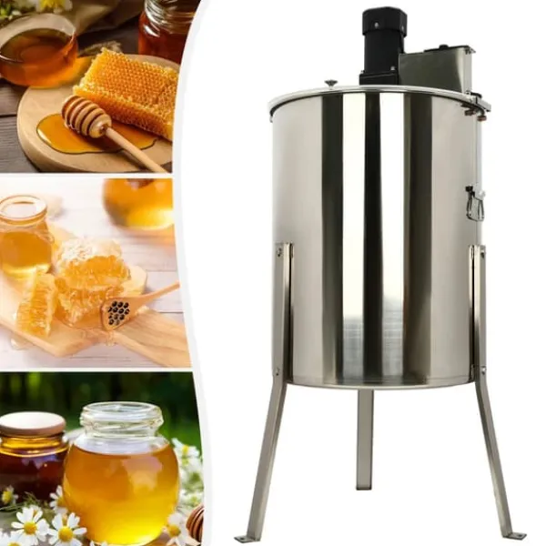 Elektrisk honungsslunga för 8 ramarDenna cylindriska honungsslunga med 220 V och 140 W vertikalmotor gör honungsskörd snabbare och enklare. Den rymmer 8 ramar (4 små, 4 standard) och arbetar runt 370 varv/min – perfekt för hobbybiodlare och småskaligt bruk.