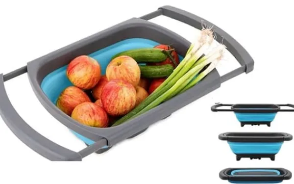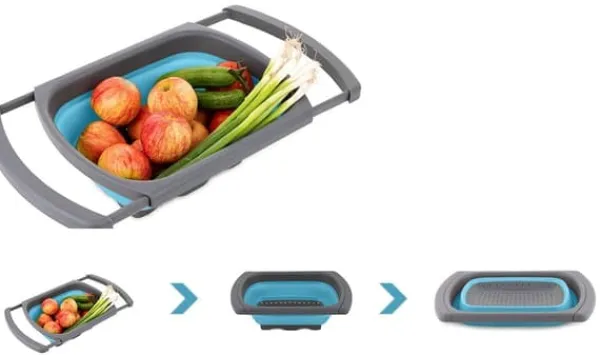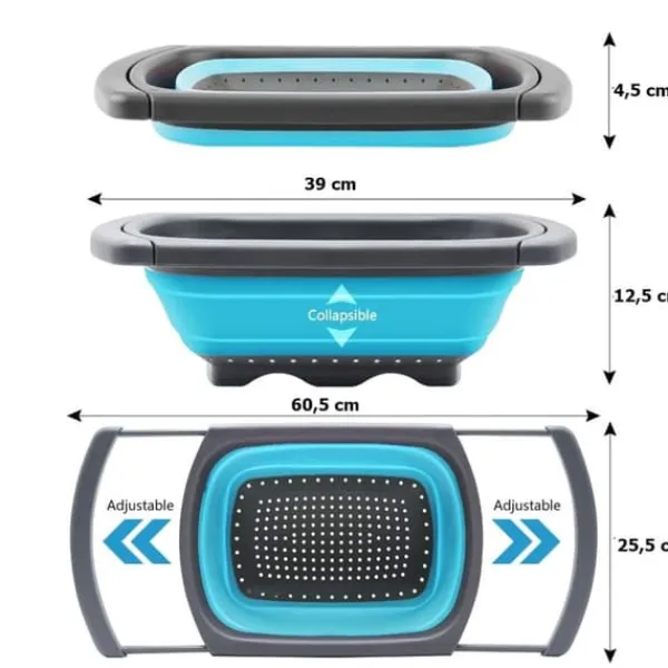 Hopfällbar matsil med utdragbara handtag, perfekt för att rinna av pasta, grönsaker och frukt. Tack vare de utdragbara handtagen kan den enkelt hängas över diskhon, och det enkla viksystemet hjälper till att spara utrymme
