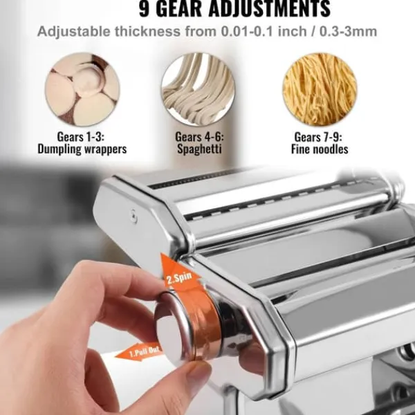 -Denna nudelrulle och -skärare har inte bara 9 nivåer av justerbar nudeltjocklek, utan erbjuder också olika breddalternativ. Du kan välja efter dina egna preferenser, och operationen är mycket enkel när du väl kommit igång.