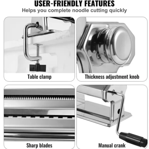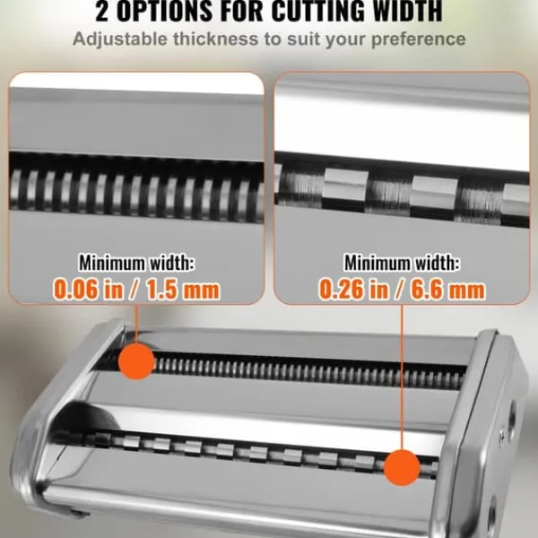 – Olika breddinställningar för olika smaker: Nudelvalsen och skäraren av rostfritt stål kan skära nudlar i två olika bredder: 0,06 tum eller 0,26 tum. Den är mycket lämplig för att göra tunna nudlar, pasta, etc., för att möta olika behov av pastatillverkning.