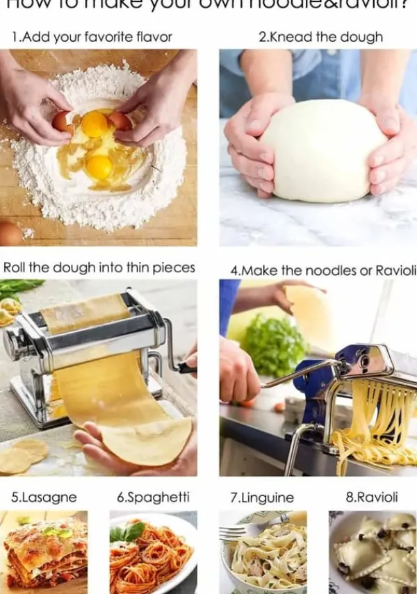 -Möjlighet att göra olika typer av pasta: Denna pastatillverkningsverktygssats låter dig göra en mängd olika pastarätter. Du kan använda den för att göra änglahårspasta, spagetti, lasagne eller andra typer av pasta. Njut av en mängd färsk hemlagad pasta med din familj.